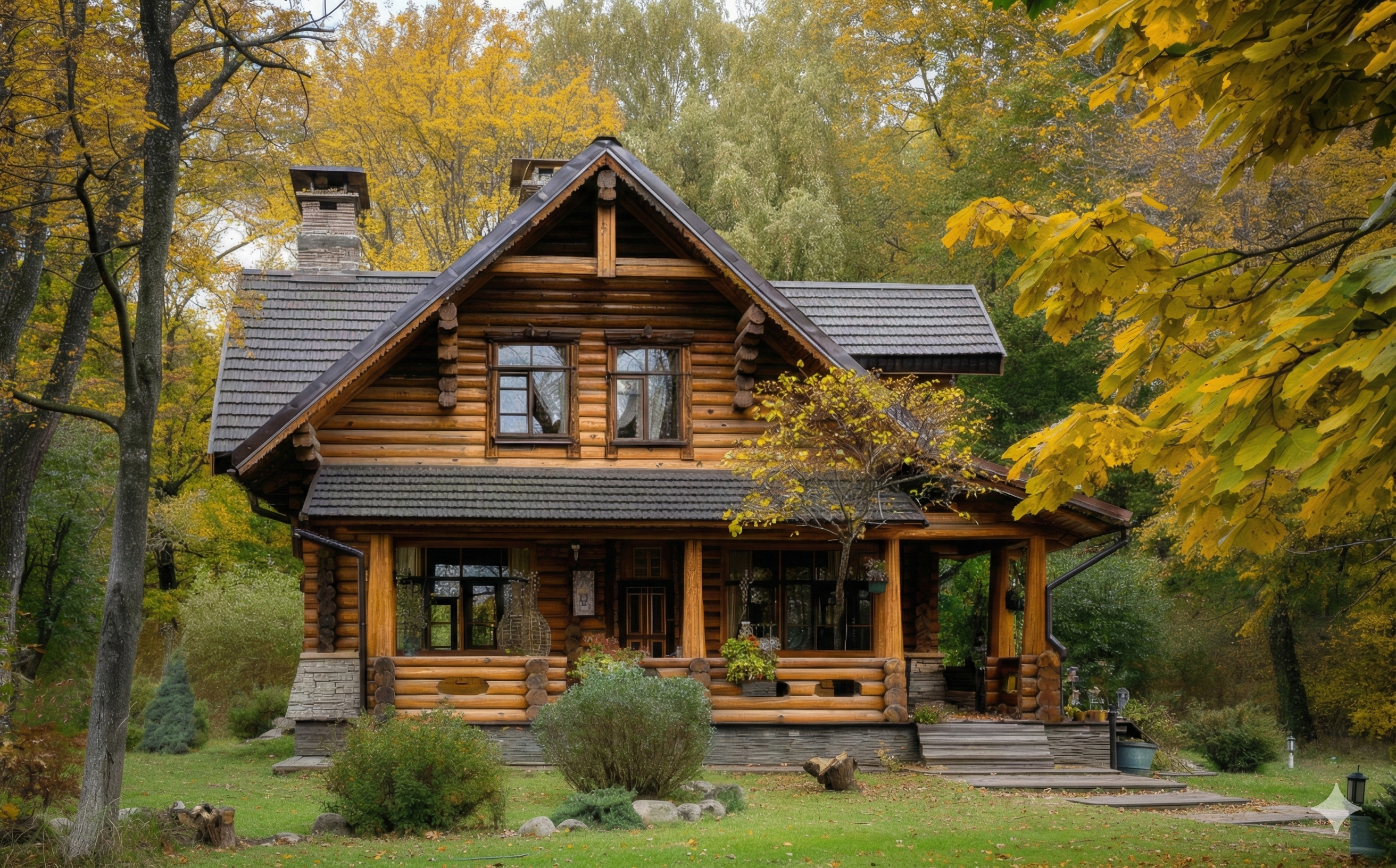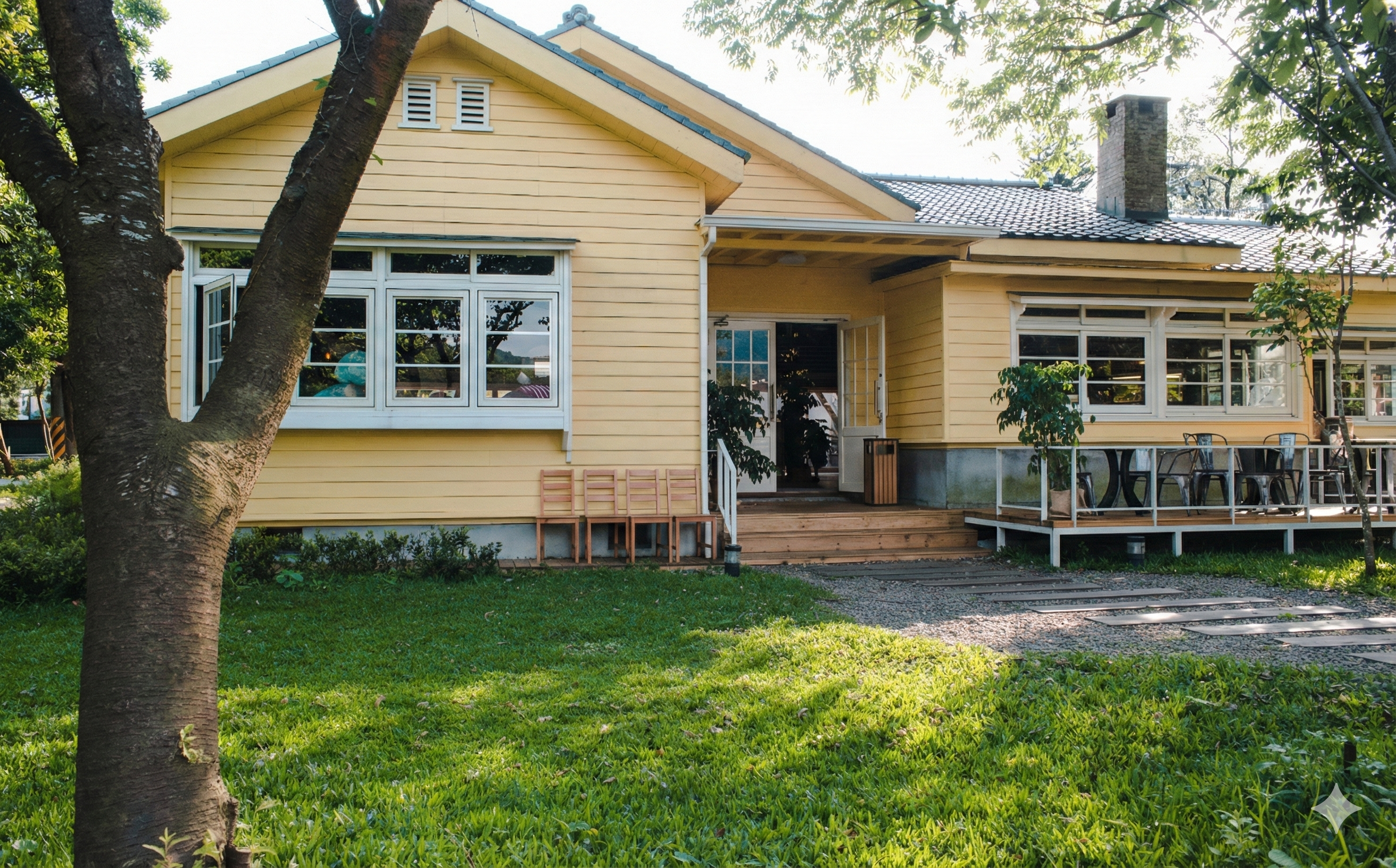 Rustic yellow wooden farmhouse surrounded by lush green lawns and mature trees.